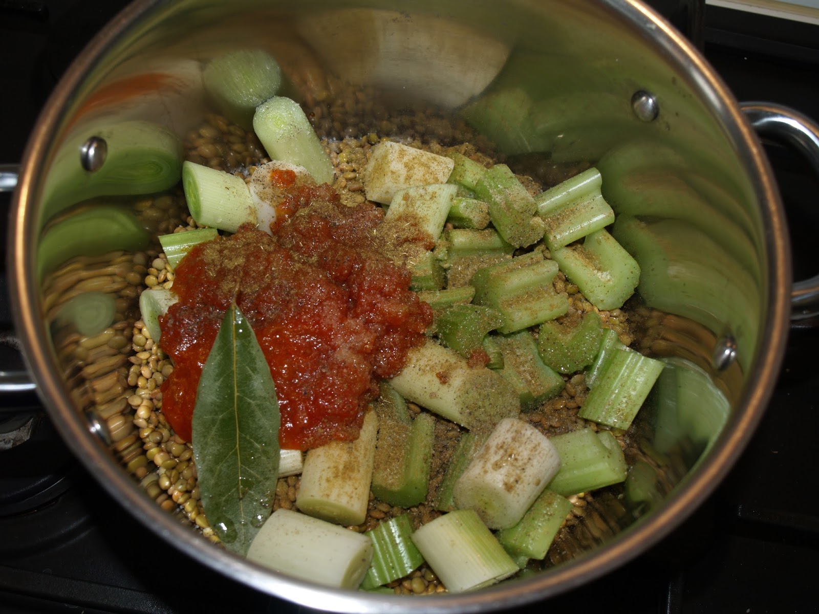 - Al día siguiente las escurrimos bien y las colocamos en una cazuela. Añadimos trozos de apio, puerro previamente lavados. También un poco de tomate frito (yo lo pongo a ojo, es para más sabor. Un par de cucharadas colmadas o así), sal, pimienta y comino al gusto y la hoja de laurel lavada, y cubrimos con agua.