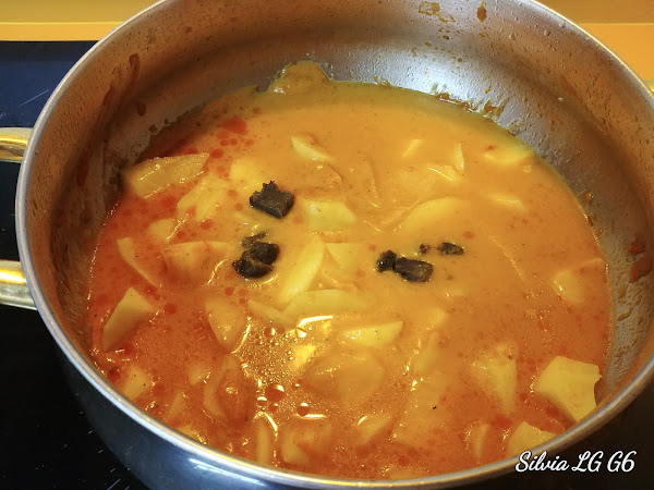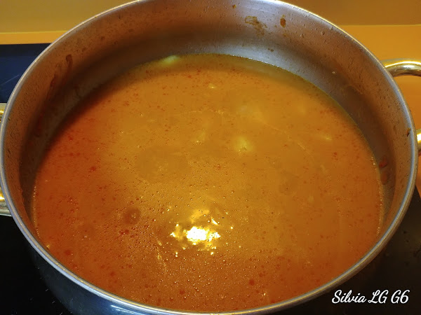 Ahora pasaremos esto por la batidora y lo volvemos a poner en la olla junto con las dos pastillas de caldo, las patatas a trozos y un litro de agua aproximadamente.