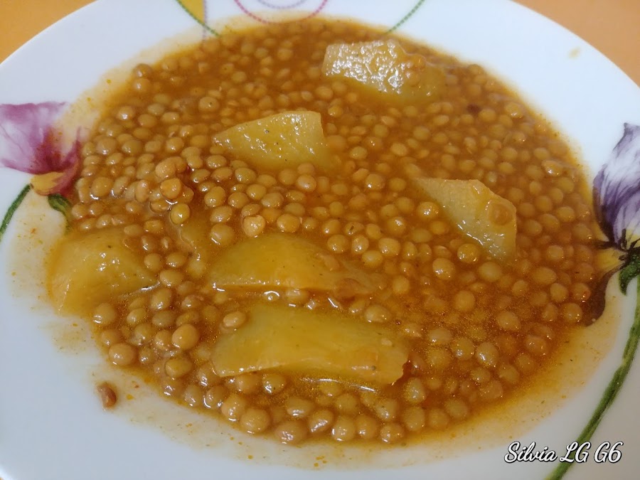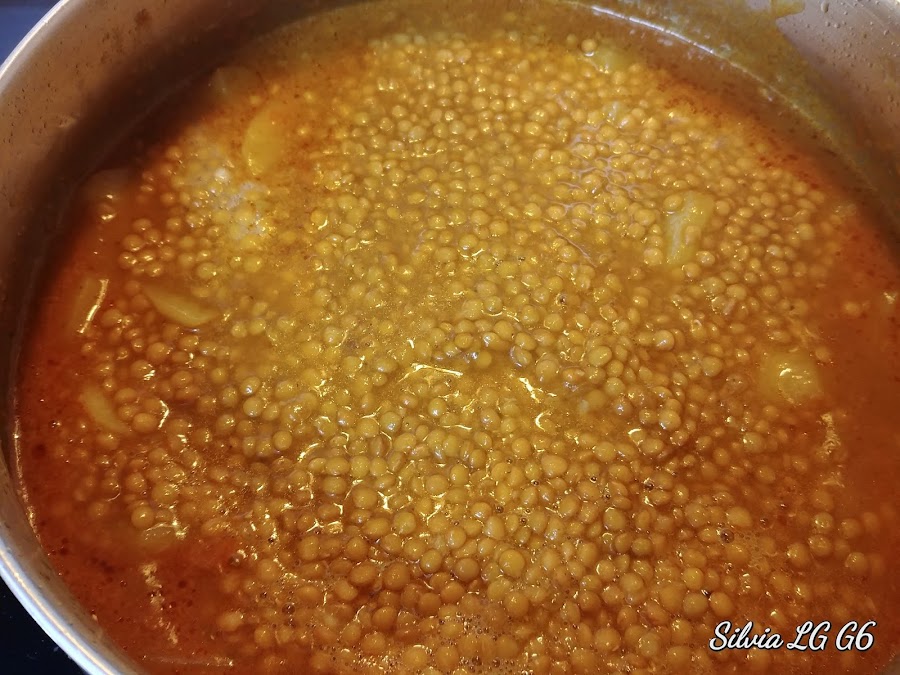 Dejamos hasta que las patatas estén tiernas. Luego solo tenemos que enjuagar bajo el chorro del grifo las lentejas y añadirlas a la olla. Dejamos un par de minutos más y listo.