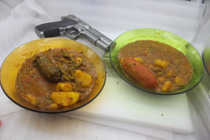 Una vez sacada la tapadera, encendemos nuevamente el fuego a media potencia y añadimos las patatas peladas y cortadas a trocitos grandes, las pimientas de Cayena, la judías verdes troceadas, el colorante alimentario, rectificamos el punto de sal y dejamos cocer unos 15-20 minutos, hasta que las judías y las patatas comiencen a estar tiernas.