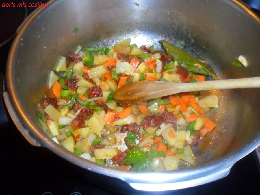 Rehogamos a fuego medio-bajo unos minutos, agregamos el chorizo sin la piel que le recubre y cortamos con unas tijeras.