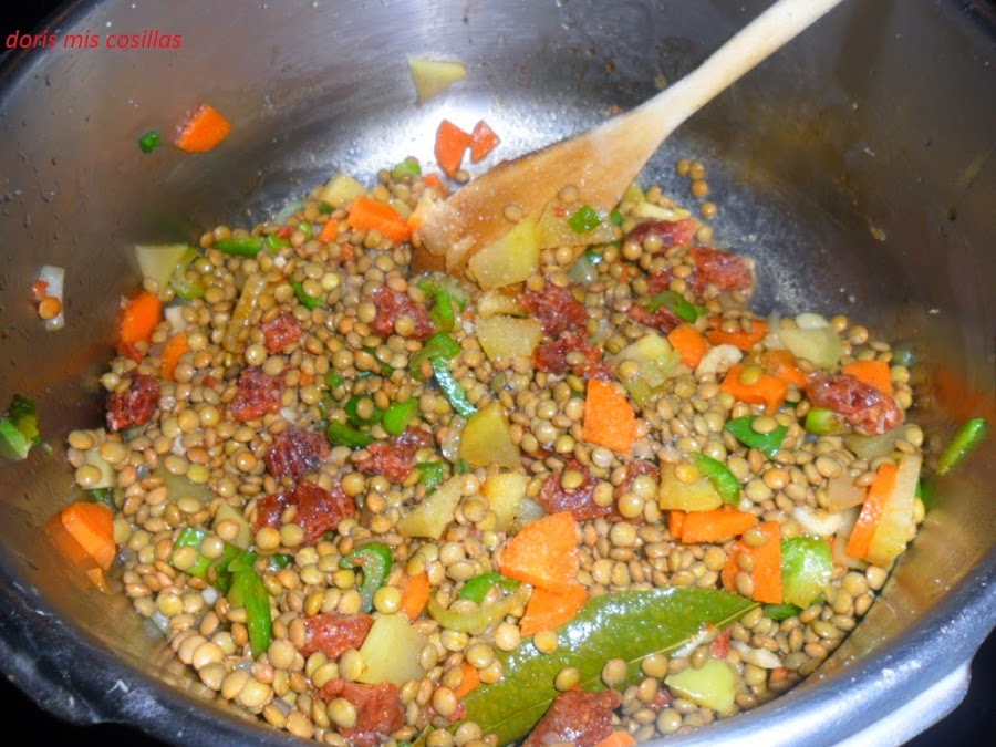 Una vez esté bien pochado todos los ingredientes agregamos las lentejas en remojo escurridas y damos una vuelta con la cuchara de madera.