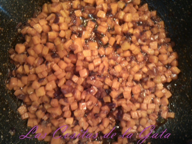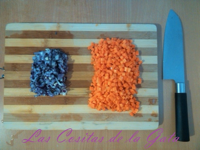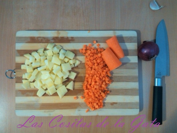 Puesto todo esto al fuego, ir preparando el resto. Hay que cortar la patata en trozos no muy grandes y echarla a la olla, yo la eché tras el segundo vaso de agua fría. Después toca cortar la zanahoria y la cebolla en trozos pequeños. Lo ideal sería echar también pimiento, pero en esta ocasión no tenía. Hay que guardar la zanahoria, la cebolla y el pimiento, si se tuviese, pues son esenciales para darle el mejor sabor a las lentejas.