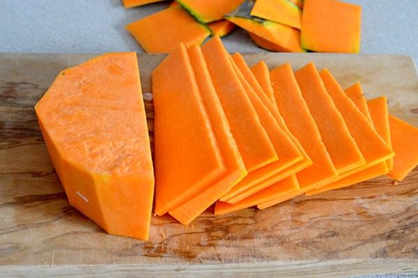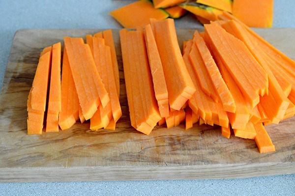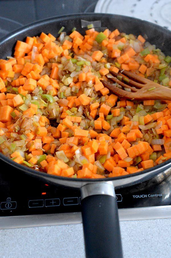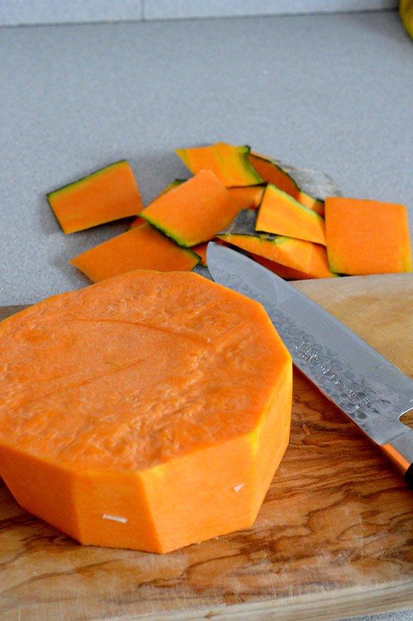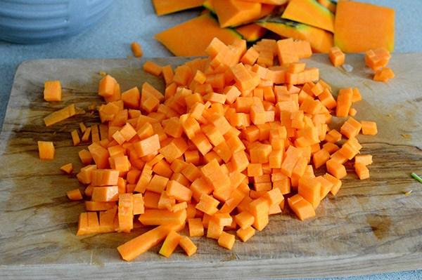 Troceamos la calabaza en cubitos y la añadimos al refrito. Salteamos durante unos 5-7 minutos a fuego fuerte.