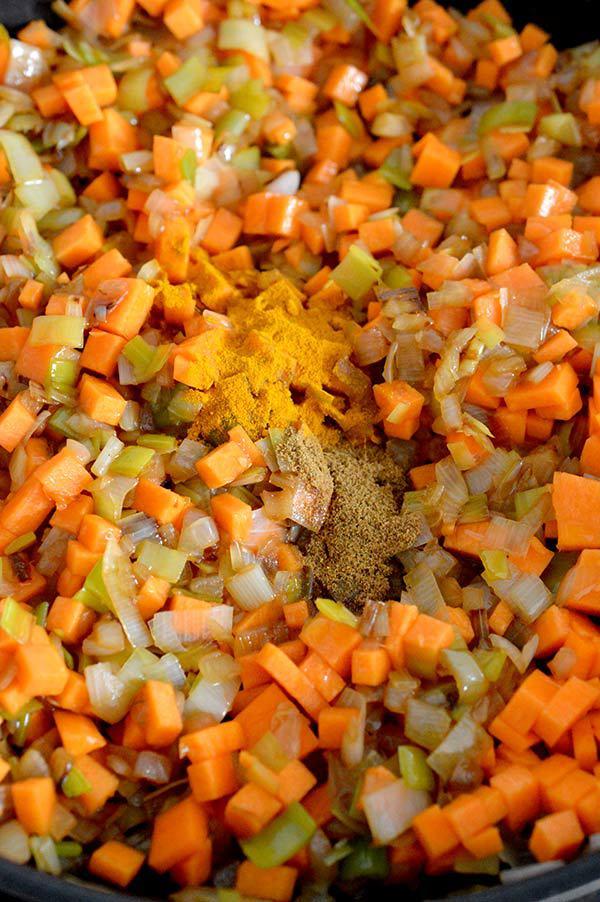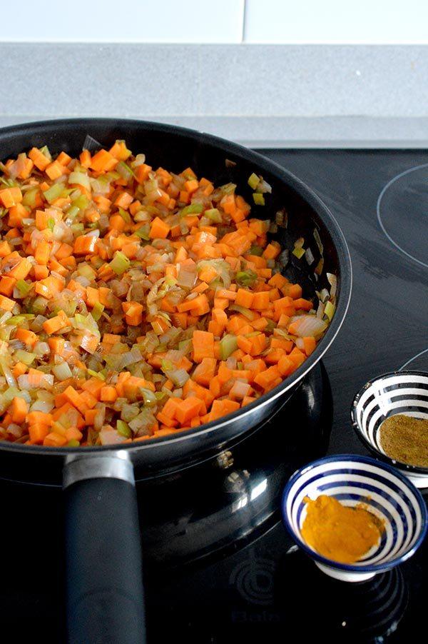 Añadimos el comino y la cúrcuma. Sofreímos 2 minutos mas.