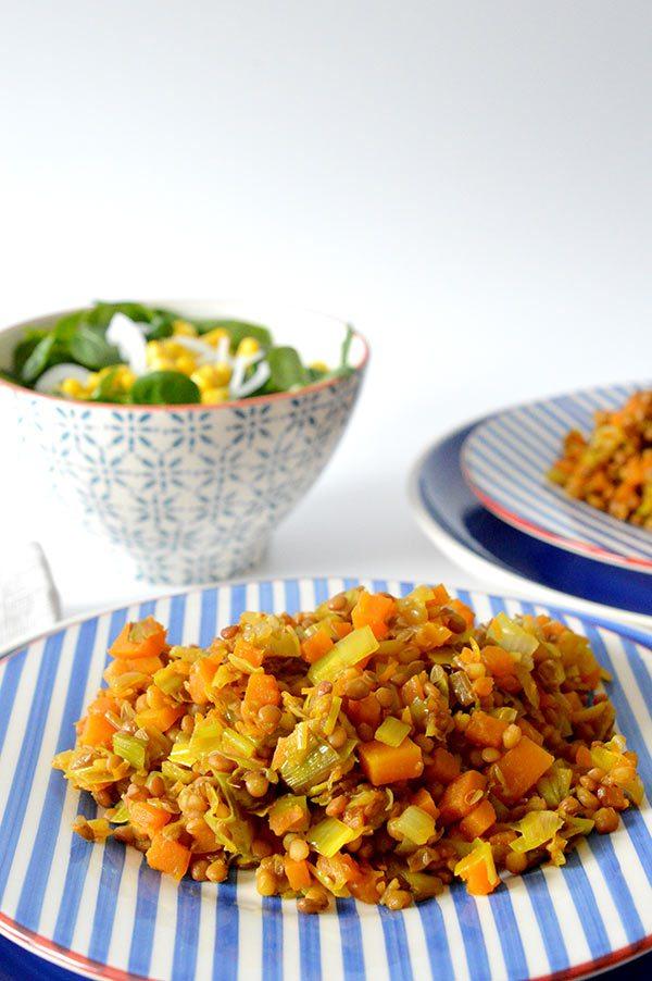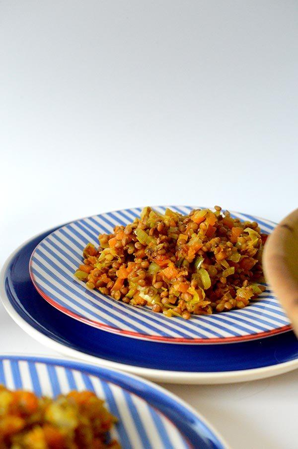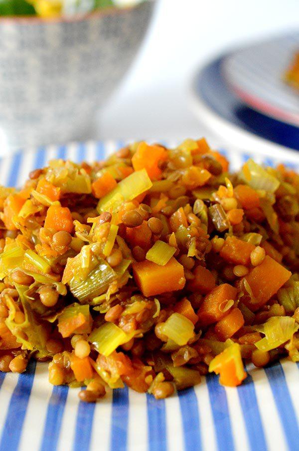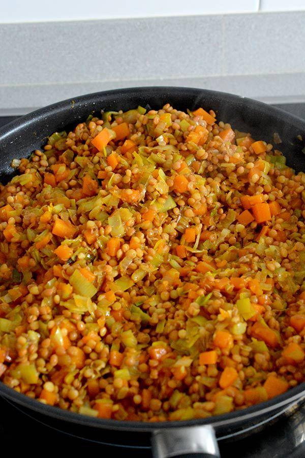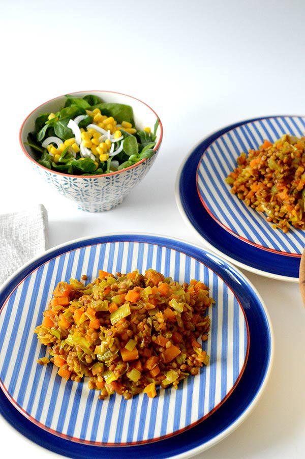 La calabaza y el puerro son las verduras con las que normalmente yo estofo las lentejas así que sabia de antemano que salteadas con estas verduras iban a estar de muerte! Es una receta que recuerda a los garbanzos salteados pero usando otras verduras, aunque seguro que con berenjena y cebolla están también buenísimas!!!