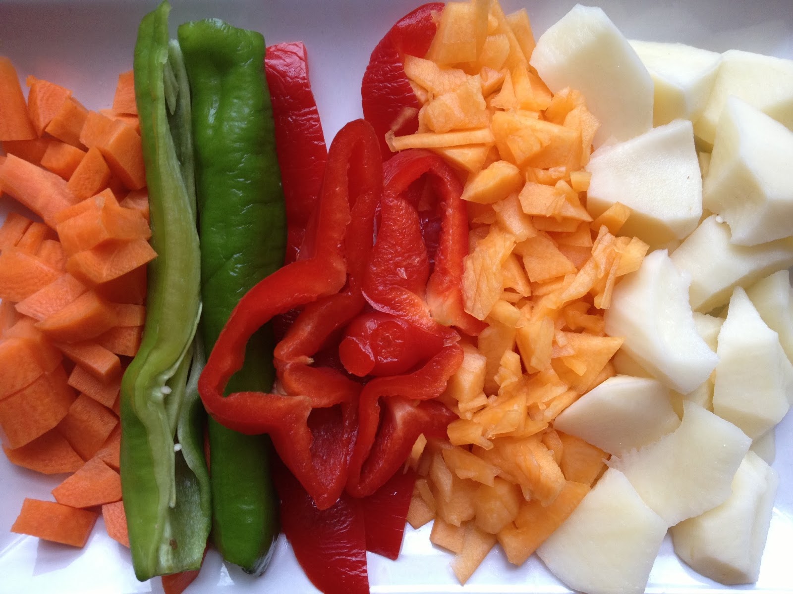 4 Limpiamos los pimientos rojos y verdes de pepitas y también las añadimos a la cazuela, el pimiento rojo al ser mas grande lo cortamos en varios trozos .