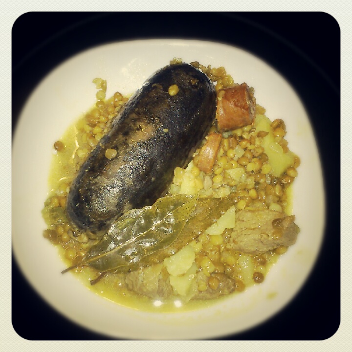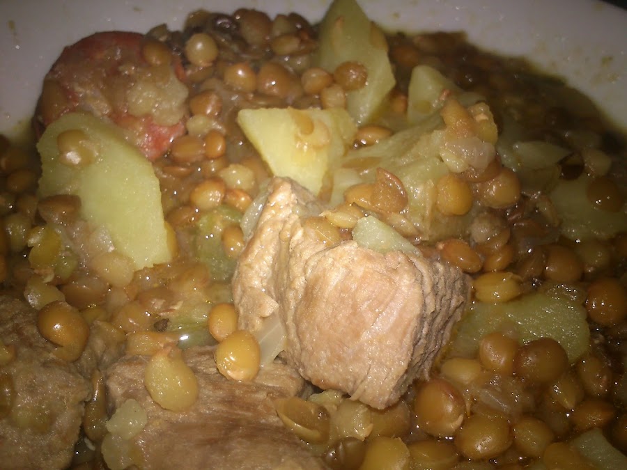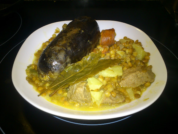 Bueno tenemos el sofrito en la olla, echamos las lentejas de bote,o las lentejas previamente cocidas, y añadimos un poco de agua, las 3 hojas de laurel, las patatas cortadas, como mas os gusten a mi me gusta cascarlas, para que salga bien el almidón el chorizo y la morcilla, y en mi olla, tiene una opcion de legumbre y pone unos 20 min. pulsar y esperar a que pite y asi quedan despues.