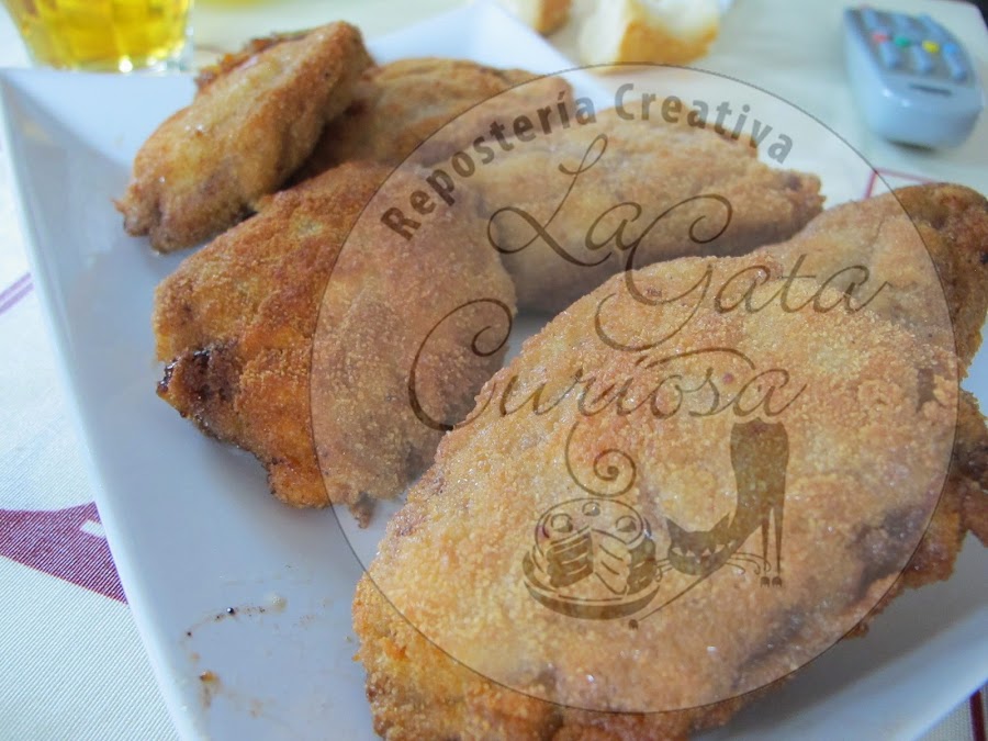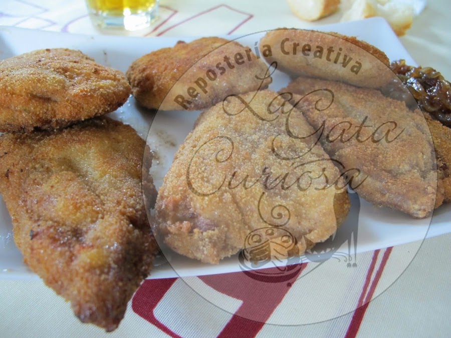 Salamos los libritos por los dos lados, ponemos un trocito de queso en cada uno y una cucharadita de cebolla caramelizada, pasamos por harina, luego por el huevo batido y por ultimo por el pan rallado, freímos en abundante aceite caliente.