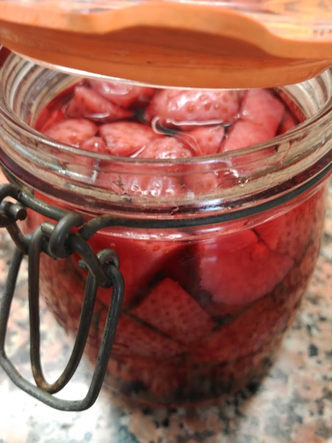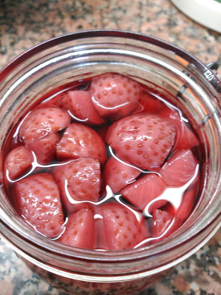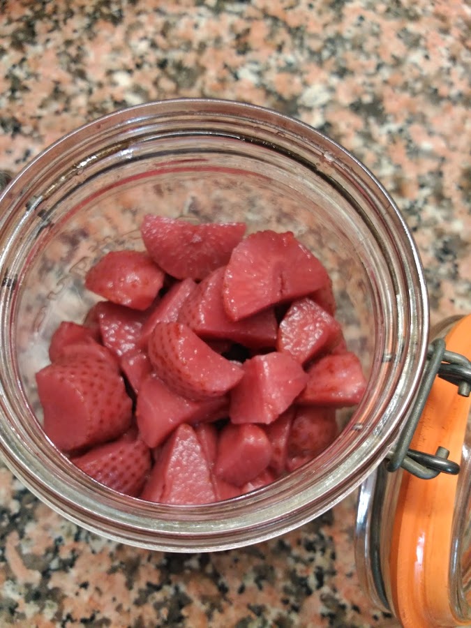 Troceamos las fresas y vertemos encima el aguardiente. Cerramos bien.