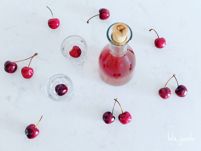 Ya os expliqué un truco para poder deshuesar las cerezas más fácilmente cuando preparamos el salmorejo de cerezas. Cogemos la botella donde vamos a elaborar nuestro licor y una pajita, colocamos la cereza en la boca de la botella y presionamos el corazón de la cereza, el hueso cae en el interior de la botella y el fruto queda en la boca de la botella para poderlo utilizar en otra receta.