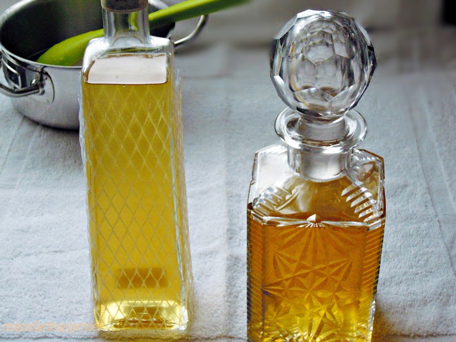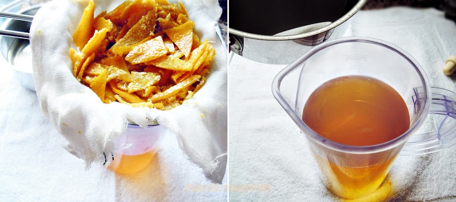 Cuela el alcohol de las cáscaras de mandarina y añade el almíbar frío.