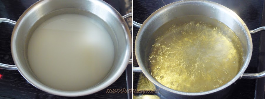 Pon un cazo al fuego con el agua y el azúcar, cuece durante unos cinco minutos y deja que se enfríe.