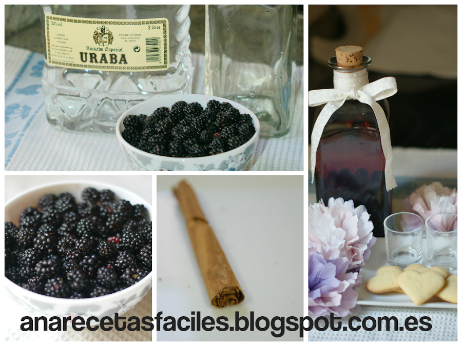 Hoy quiero proponer una receta original con moras. Seguimos en temporada y hay que aprovechar la fruta que nos regala la naturaleza. Nos gustan las moras y hay que intentar guardarlas y saborearlas todo el año. Esta vez he hecho un licor y así no nos limitamos solamente a las mermeladas. Es original y muy suave para tomar esa copita digestiva depués de las comidas de celebración. Nosotros no solemos terminar las comidas con licores, pero un día es un día. Una idea de presentación es con unos corazones de galleta para acompañar, así los niños también participan de la sobremesa.Ingredientes