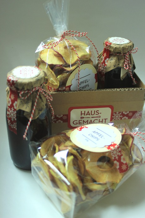 Hice todo! la cajita con su sello "hecho en casa" (Hausgemacht) el licor y chips de manzana, éstas también de mi jardín.