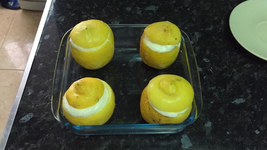 En una bandeja o fuente, colocamos los limones vacíos y empezamos a rellenarlos con la manga pastelera.