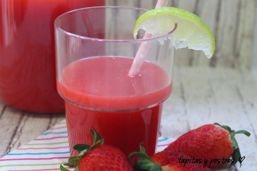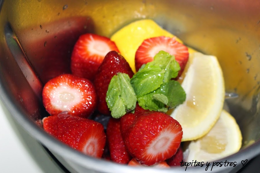 Si lo preparamos sin thermomix, el procedimiento es igual, pero lo haremos con una batidora eléctrica y triturando un minuto hasta conseguir dejar el limón y las fresas bien licuados. El resto igual.