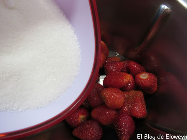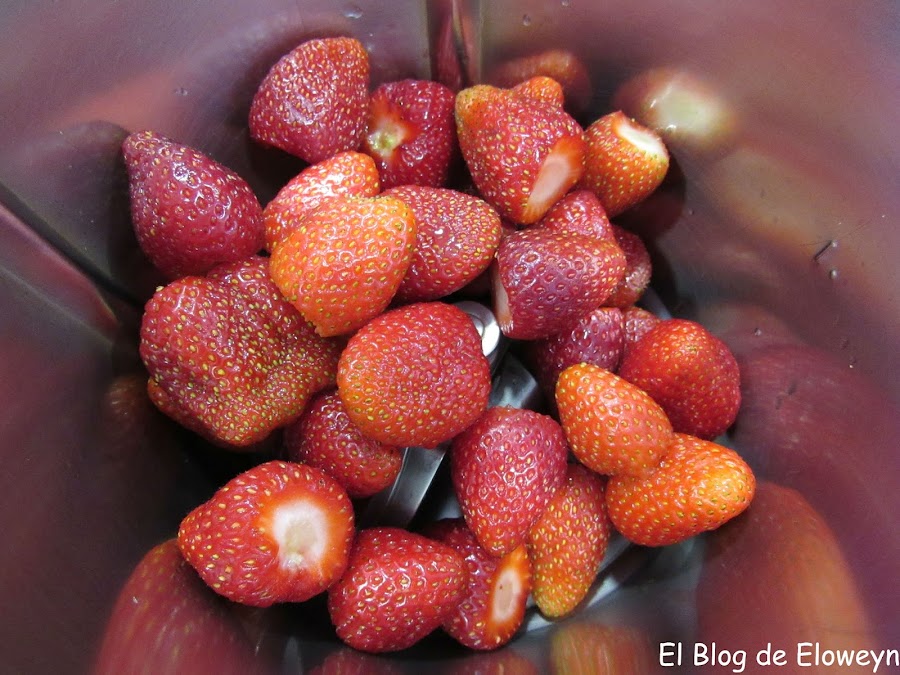 A continuación, le quitamos el rabito a las fresas y las ponemos en el vaso de la Thermomix o en el recipiente donde se vayan a triturar con la batidora.