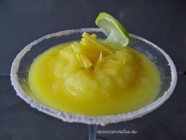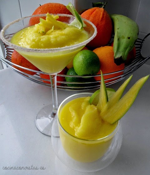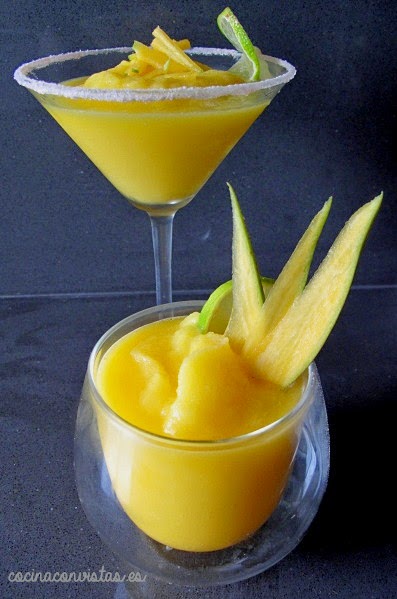 Hoy tenemos un margarita de mango delicioso... INGREDIENTES: PARA 2 Personas 1 mango 3 limones 1 lima 60 cl de tequila Sal Hielo picado Preparación: Pelar y trocear el mango Exprimir los tres limones Añadir todos los ingredientes en la batidora con el hielo picado batir y decorar el borde de la copa con sal y decorar con una rodaja de lima ( podemos añadir un poco de zumo de mango al gusto si ...