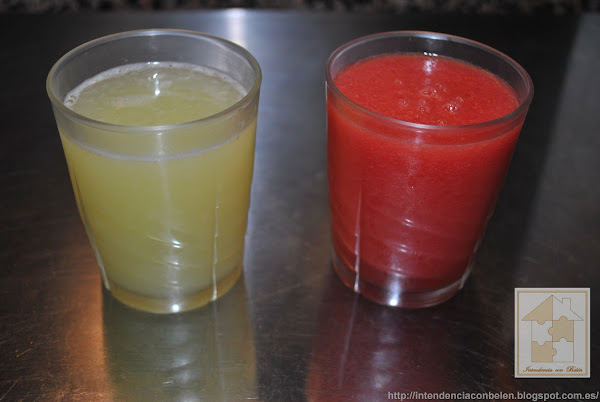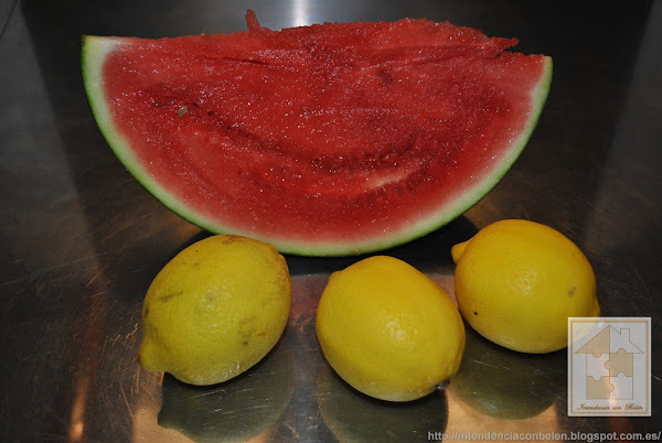 Partimos los limones, hacemos también zumo como para llenar un vaso. Misma cantidad de zumo de sandía que de limón.