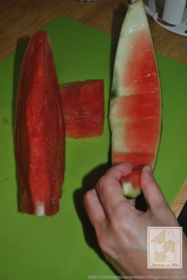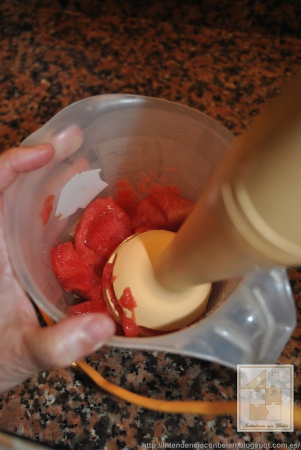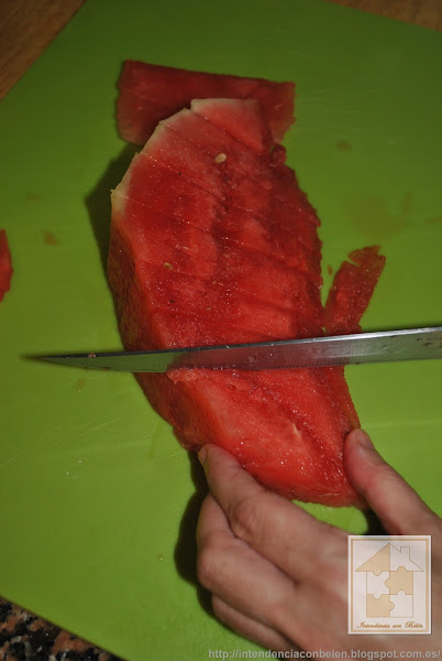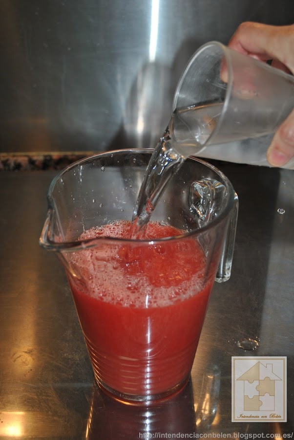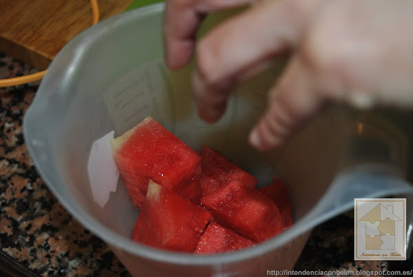 Troceamos la sandía, incorporamos a una jarra o a nuestra licuadora y hacemos zumo como para llenar un vaso.