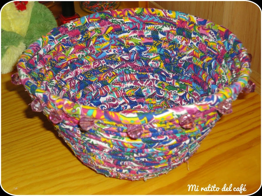 Pero sobre todo lo dedicamos a las manualidades y a la costura, donde se mueve como pez en el agua. Lo último ha sido enseñarme a crear una cesta hecha de rulos de cuerda envueltos de tela y cosidos.