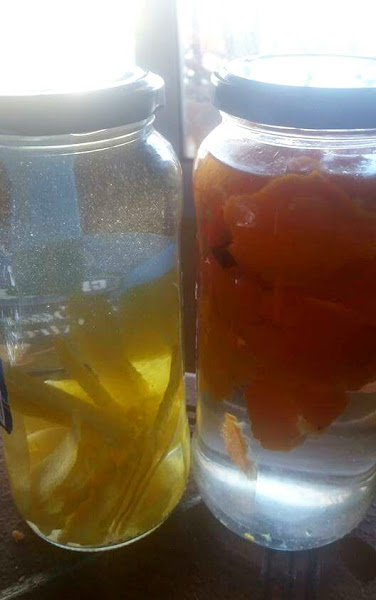 Lo ideal es hacerlo con limones ecológicos, sin ningún pesticida ni guarrerías ;) . Si no podemos conseguirlos, tenemos que lavarlos muy bien. A continuación los pelamos (yo lo hice con un pelador de patatas) tenemos que tener mucho cuidado para que sólo cortemos la piel amarilla, nada de blanco, sino, amargará. Ponemos las pieles en un bote y echamos el alcohol, cerramos y guardamos en un sitio que no le de mucha luz. En la siguiente foto podéis ver los dos licores, el de limones y el de mandarina, justo cuando los íbamos a guardar.