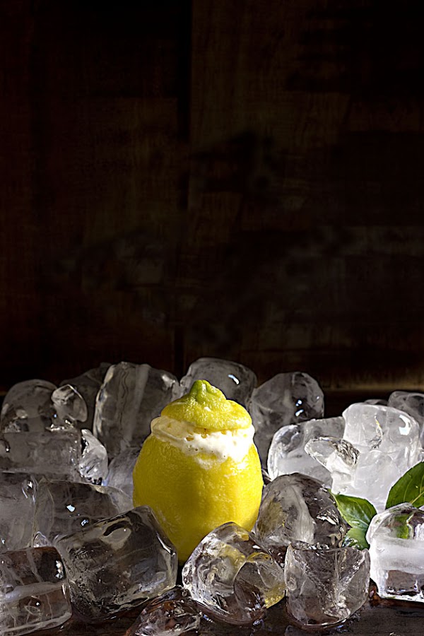 Elaboración:Cortamos la parte superior de los limones y con un sacabolas extraemos toda la pulpa con mucho cuidado para mantener intacta la corteza. Hacemos una base cortando la parte inferior. Metemos los limones en el congelador para que endurezcan.
