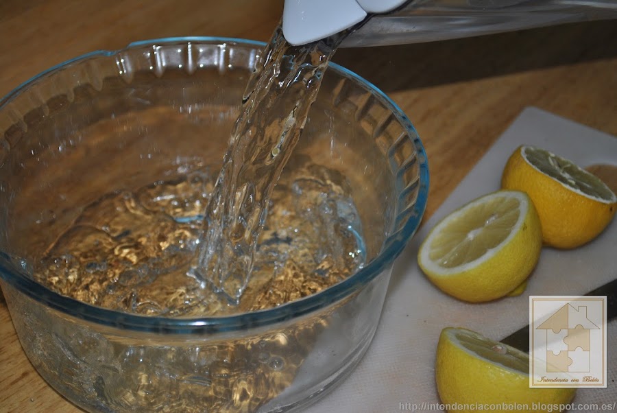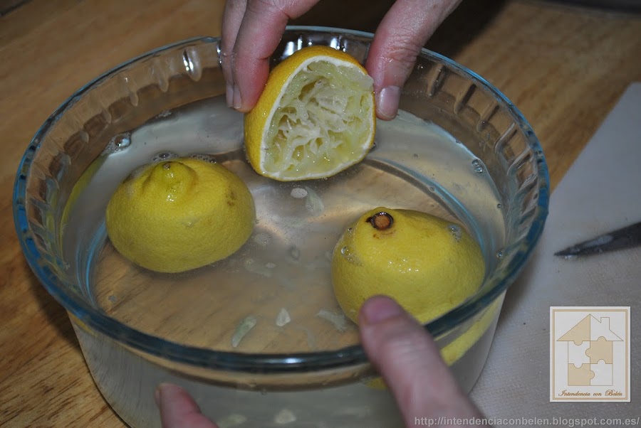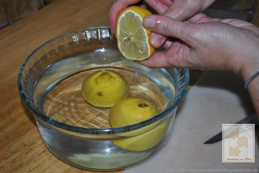 Parte un limón a la mitad y mételo en el bol con agua. Y coge otro y exprímelo dentro y deja la cascara también dentro.