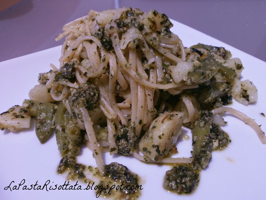 El pesto es, en mi humilde opinión, una de las salsas más ricas que haya, además de que se puede utilizar para muchas otras recetas. Por lo general, se utiliza el pesto, solo, para condimentar la pasta, pero una antigua receta de Liguria(region donde nace el pesto y donde se encuentra la ciudad de Genova) también incluye la presencia de patatas y habichuelas, y si nunca lo habeis probado os anímo (y aquí me dirijo en especial a los seguidores no italianos)a que no esperéis más !!