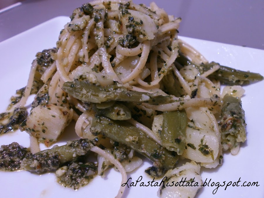 Il pesto é,a mio modesto parere,una delle salse piú buone che ci siano;oltretutto si puó usare per altre numerosissime ricette. Normalmente si usa il pesto ,da solo,per condire la pasta,ma un"antica ricetta ligure prevede anche la presenza delle patate e dei fagiolini;se non l"avete mai provato cosí (e qui mi rivolgo in particolar modo ai mei seguitori non italiani che,probabilmente,non conoscono questa versione) non aspettate oltre!!