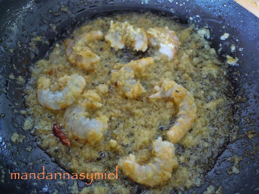 Añade los langostinos pelados y limpios, sofríe unos minutos y mueve de vez en cuando, pon la guindilla y deja unos minutos más.