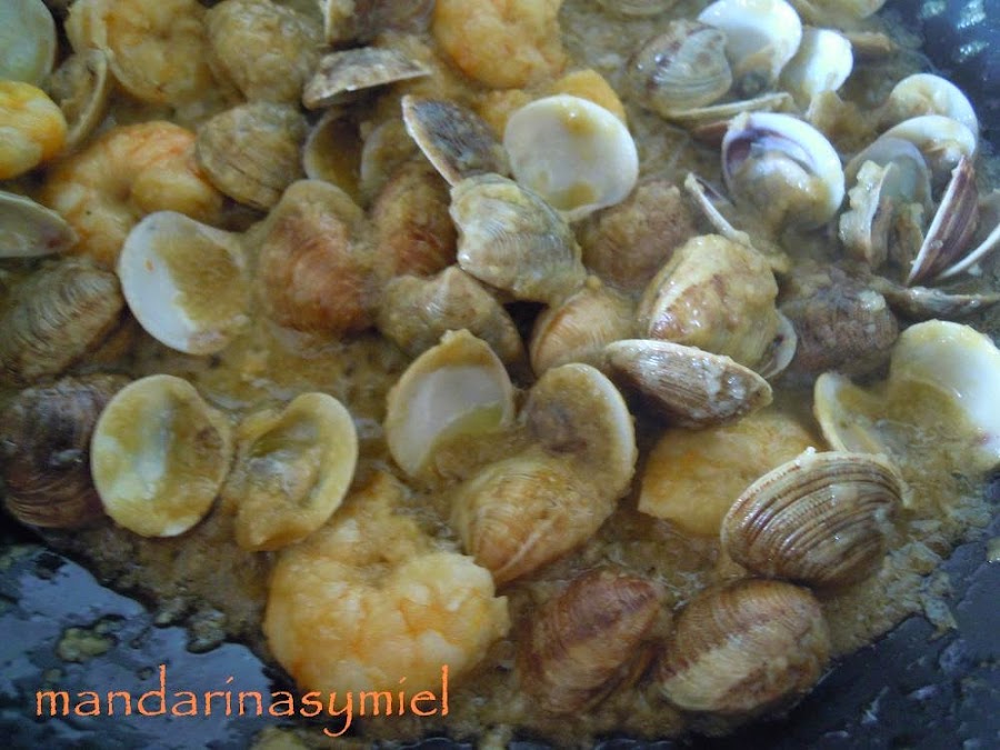 En vez de almejas he puesto chirlas ya que a mi hijo le encantan y en lugar de chile he puesto una guindillita.