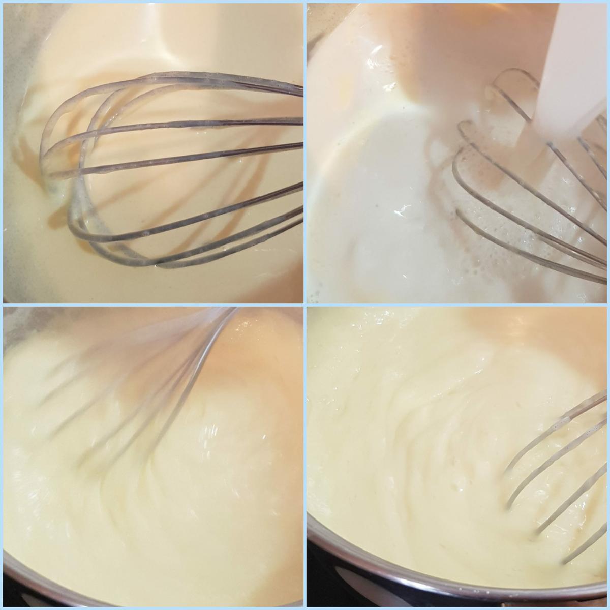 En un cazo ponemos a calentar la leche con la esencia de vainilla, cuando esté templada echamos la crema de yemas, mezclamos bien y lo dejamos a fuego medio sin parar de remover hasta que espese. Sin dejar de remover.