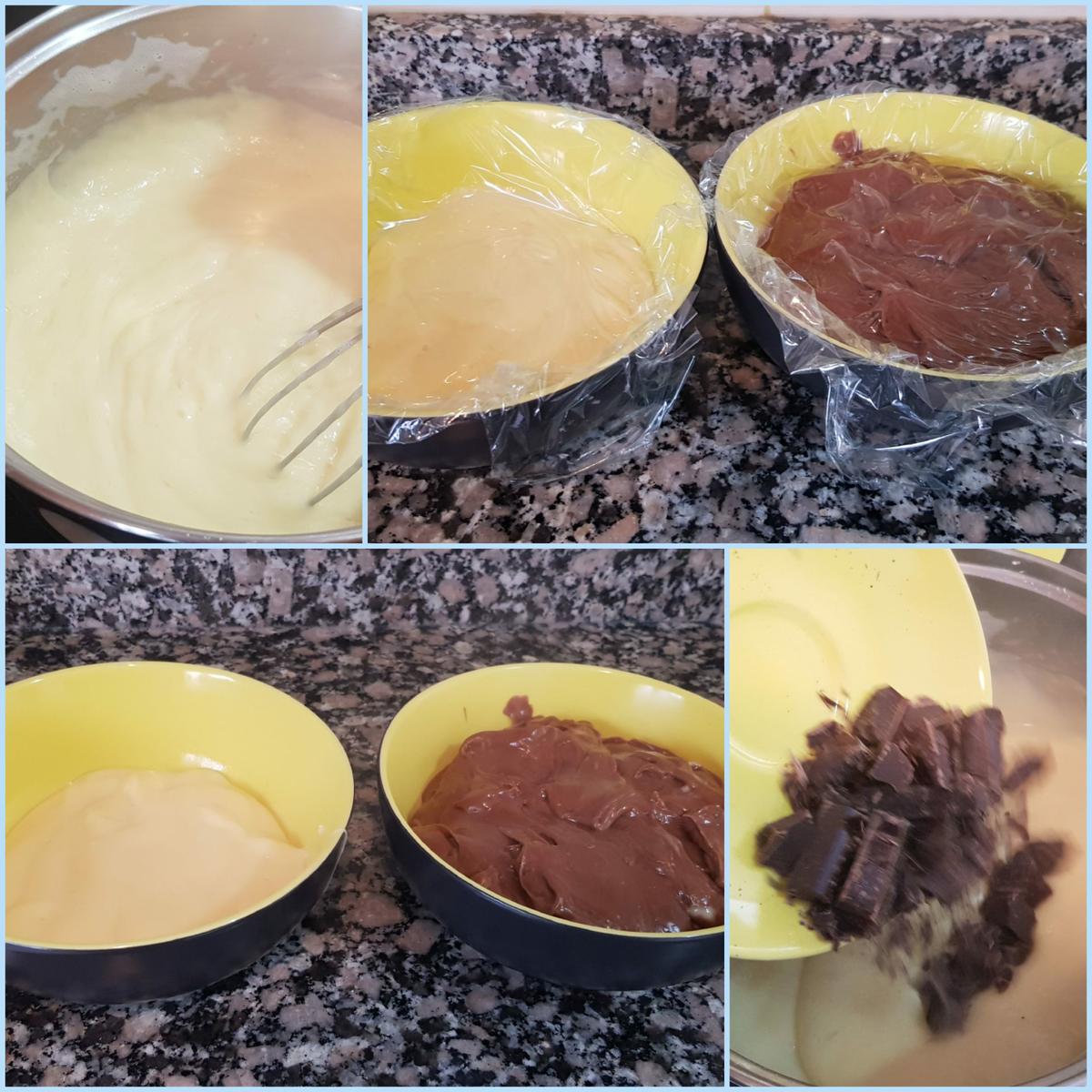 Una vez haya espesado retiramos del fuego, y este paso ya es para quien quiera hacer unas cuantas lionesas de chocolate… Repartimos la crema en dos bols y a una de ellos le añadimos el chocolate,dejamos que se funda unos minutos con el calor, y removemos bien hasta que quede bien integrado.