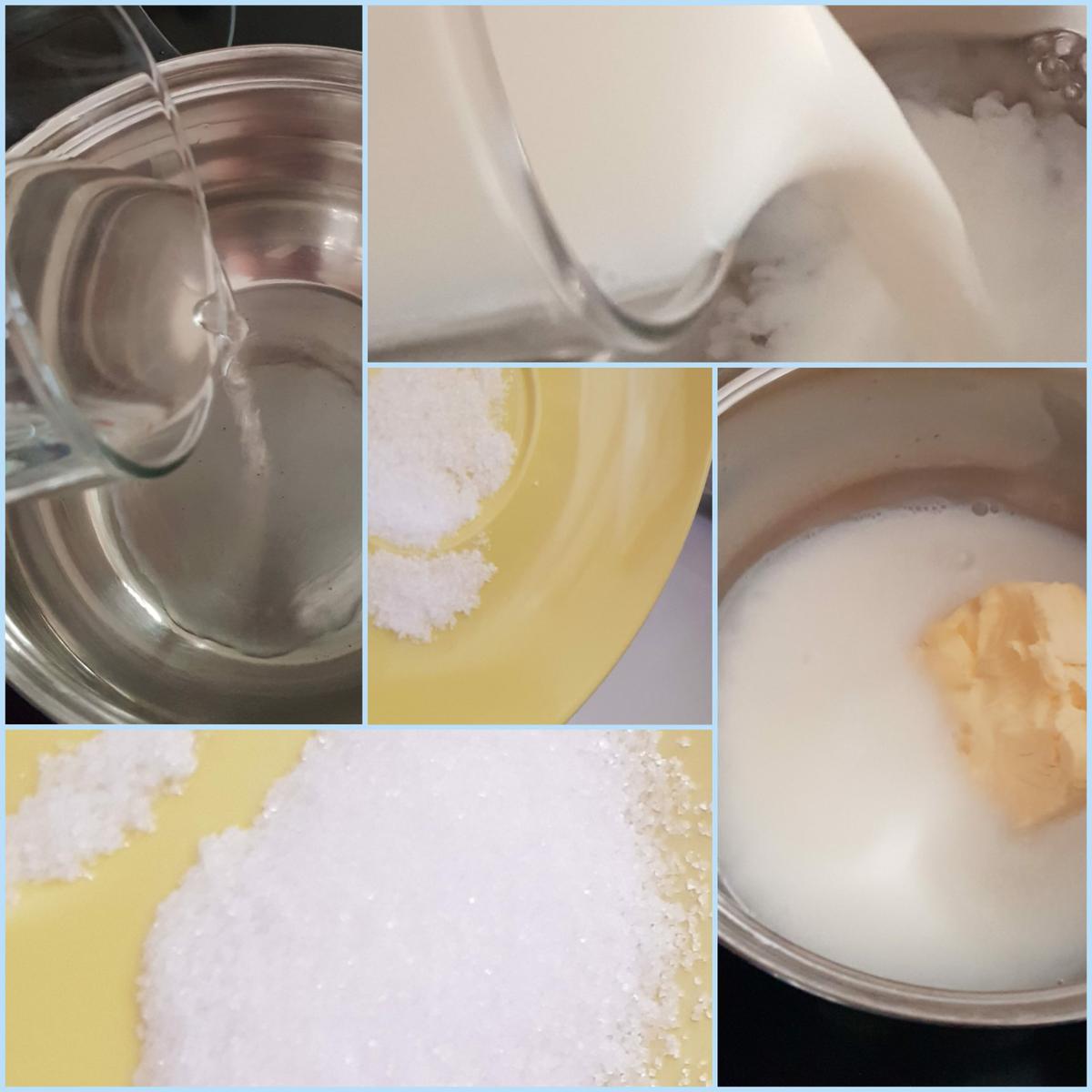 Vamos con la masa, en una olla añadimos, el agua, la leche, la sal, el azúcar y la mantequilla, a fuego medio dejamos que se funda la mantequilla y comience a hervir.