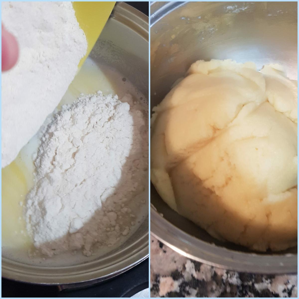 En cuanto hierva bajamos el fuego al mínimo y vertemos la harina de golpe, y con la ayuda de una paleta o lengua removemos bien hasta conseguir una masa que se despegue de las paredes, retiramos del fuego y dejamos templar unos minutos.