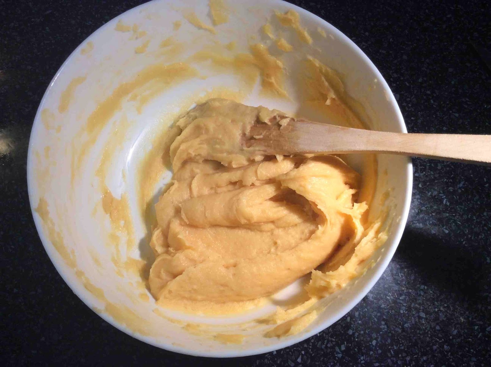 3: Retiramos del fuego i ponemos la mezcla en un bol para que se enfríe más rápido. Cuando esté fría añadimos los huevos uno a uno mientras removemos con la lengua. Incorporamos el siguiente huevo cuando el anterior esté totalmente integrado en la masa.
