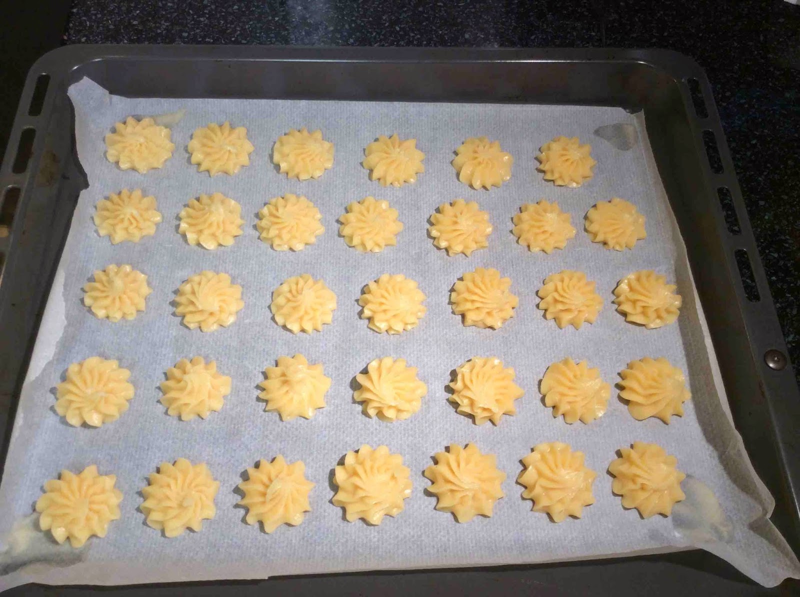 5: Cubrimos la bandeja del horno con papel de hornear y vamos haciendo rosas de manera que queden de la siguiente manera.