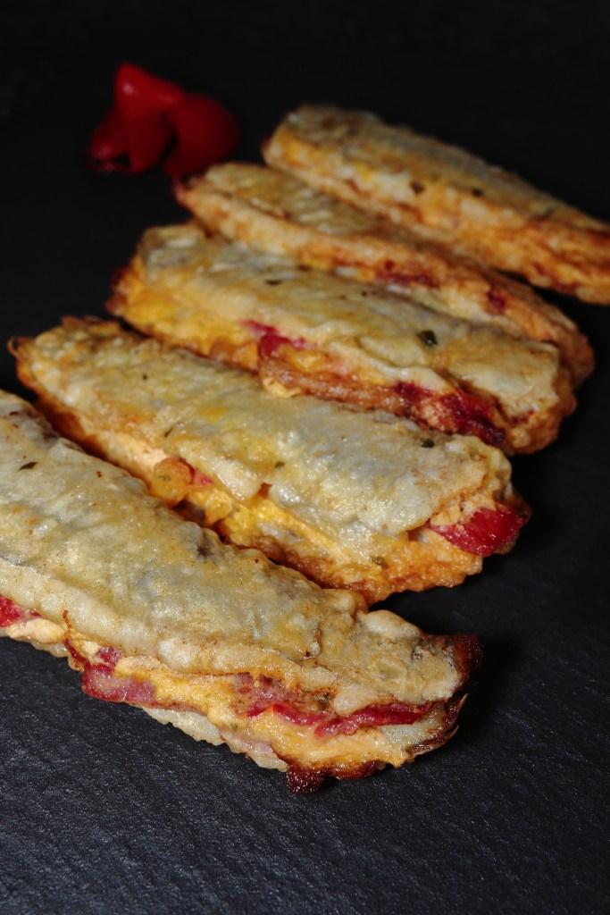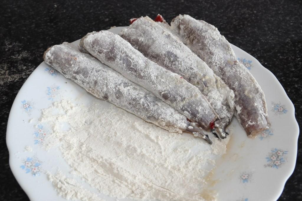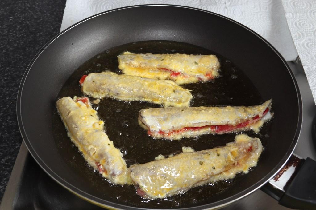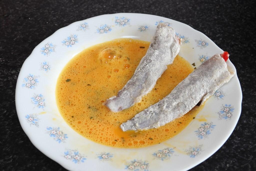 Ponemos una sartén amplia al fuego fuerte con abundante aceite de oliva. Mientras se calienta pasamos los lirios rellenos por la harina, por todas sus caras. Los mojamos bien en el huevo batido y los llevamos a la sartén con el aceite caliente.