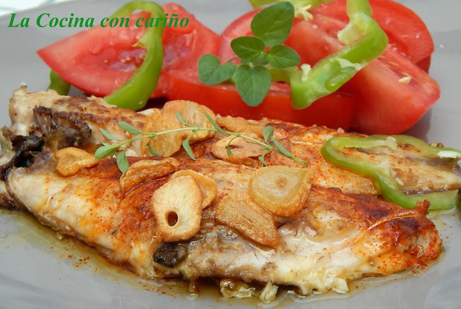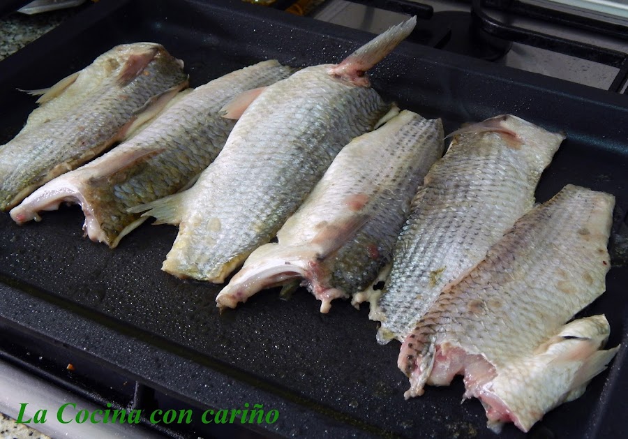 Esto es muy, muy fácil. Ponemos la plancha a fuego medio/fuerte. Cuando está caliente, echamos un hilillo de aceite y colocamos los filetes salpimentados con la carne hacia abajo, por un minuto, no más, así sellamos y no perdemos jugos. Damos la vuelta y por la parte de la piel, lo dejamos 2 ó 3 minutos, depende de los gruesos que sean los filetes. Hemos de hacerlo lo justo, no más.