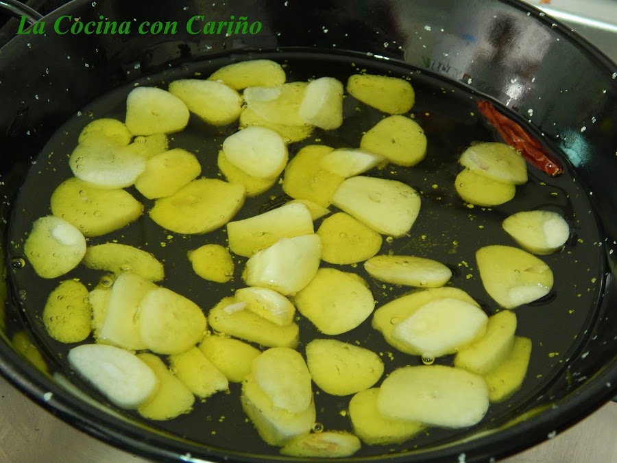 Cuando están listos los apartamos y en aceite de oliva, en una sartén a fuego medio, freímos los ajos.,con la guindilla. Una vez van tomando color dorado, apartamos y añadimos el pimentón, una cucharadita de café, removemos y acto seguido el vinagre.
