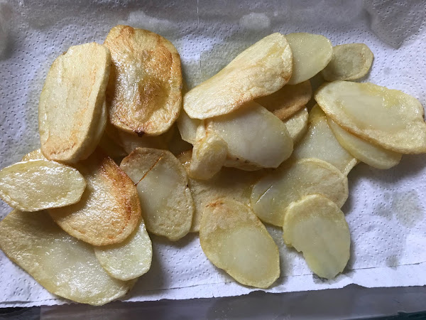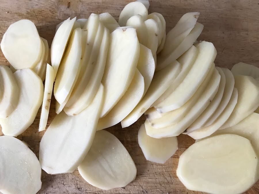 Pelamos las patatas y las cortamos a rodajas finas,