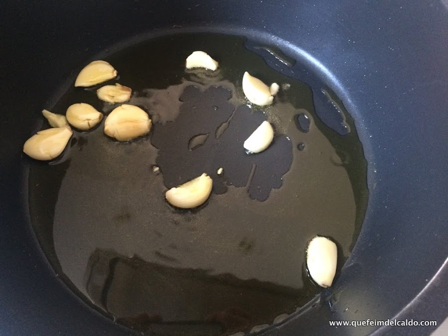 Ponemos en una cazuela 4 cucharadas soperas de aceite de oliva, la potencia del fuego lo pondremos a 5-9 y así lo tendremos todo el tiempo. Ponemos los ajos y los dejamos cocinando alrededor de 5 minutos, a esta potencia los ajos no se dorarán.