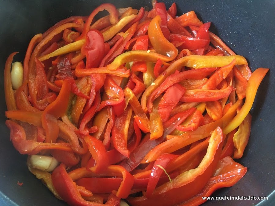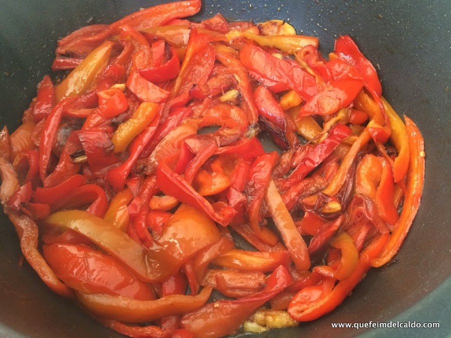 Ponemos en la cazuela las tiras de los pimientos rojos, y así los dejamos cocinando durante 1 hora.