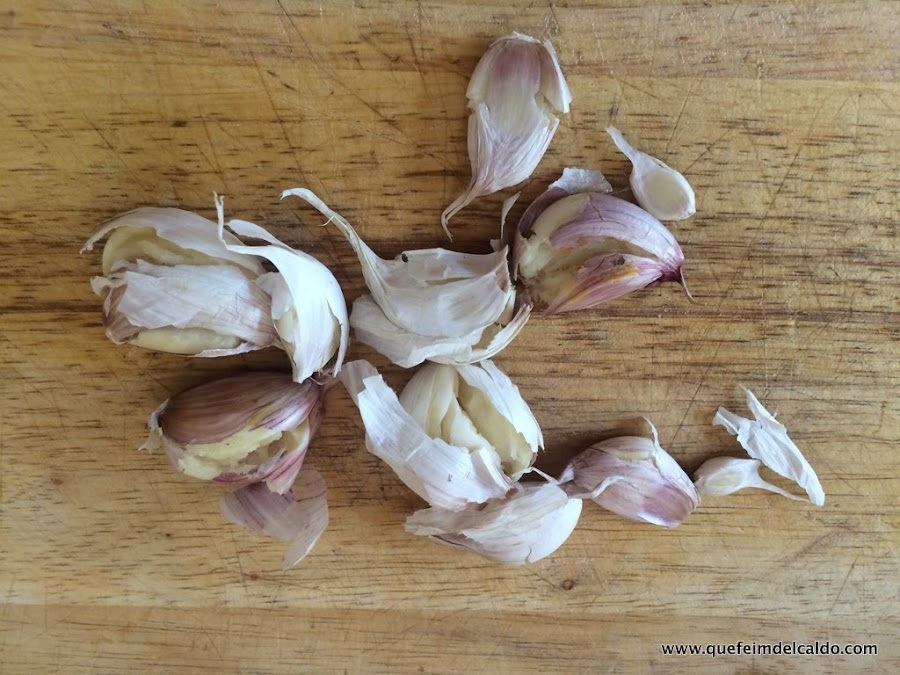 Desgajamos los ajos, los machacamos y le quitamos la piel del ajo.