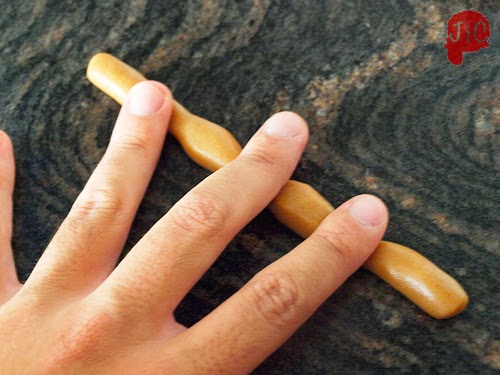 - Cogemos una bolita y hacemos un churro. Después abrimos los dedos y volvemos a amasar un poco, como se ve en la imagen de abajo, para darle forma a los nudillos. Se quedará un churro con tres o cuatro partes más gordas. ¡Estará perfecto.