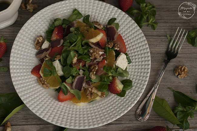 La número diez también es saludable y colorida, una ensalada de canónigos con fresas, naranja, frutos secos y jamón de pato. Una ensalada que viste de fiesta cualquier mesa y que para después de las fiestas navideñas puede ser una opción perfecta como plato único.