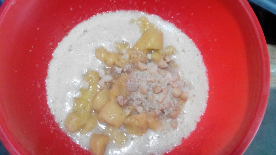 Por último agregamos harina, bicarbonato, levadura, sal y canela. Batimos todo hasta conseguir una consistencia homogénea. puede tener pedacitos de plátanos y nueces, está bien.