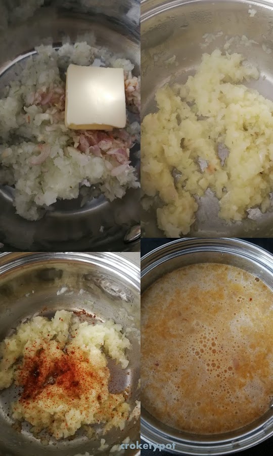 ELABORACIÓN: En un cazo ponemos la mantequilla, un poco de aceite para que no se queme la mantequilla, la cebolla, la chalota y el ajo todo muy picado y cocinamos hasta que se haga la cebolla unos cinco minutos.